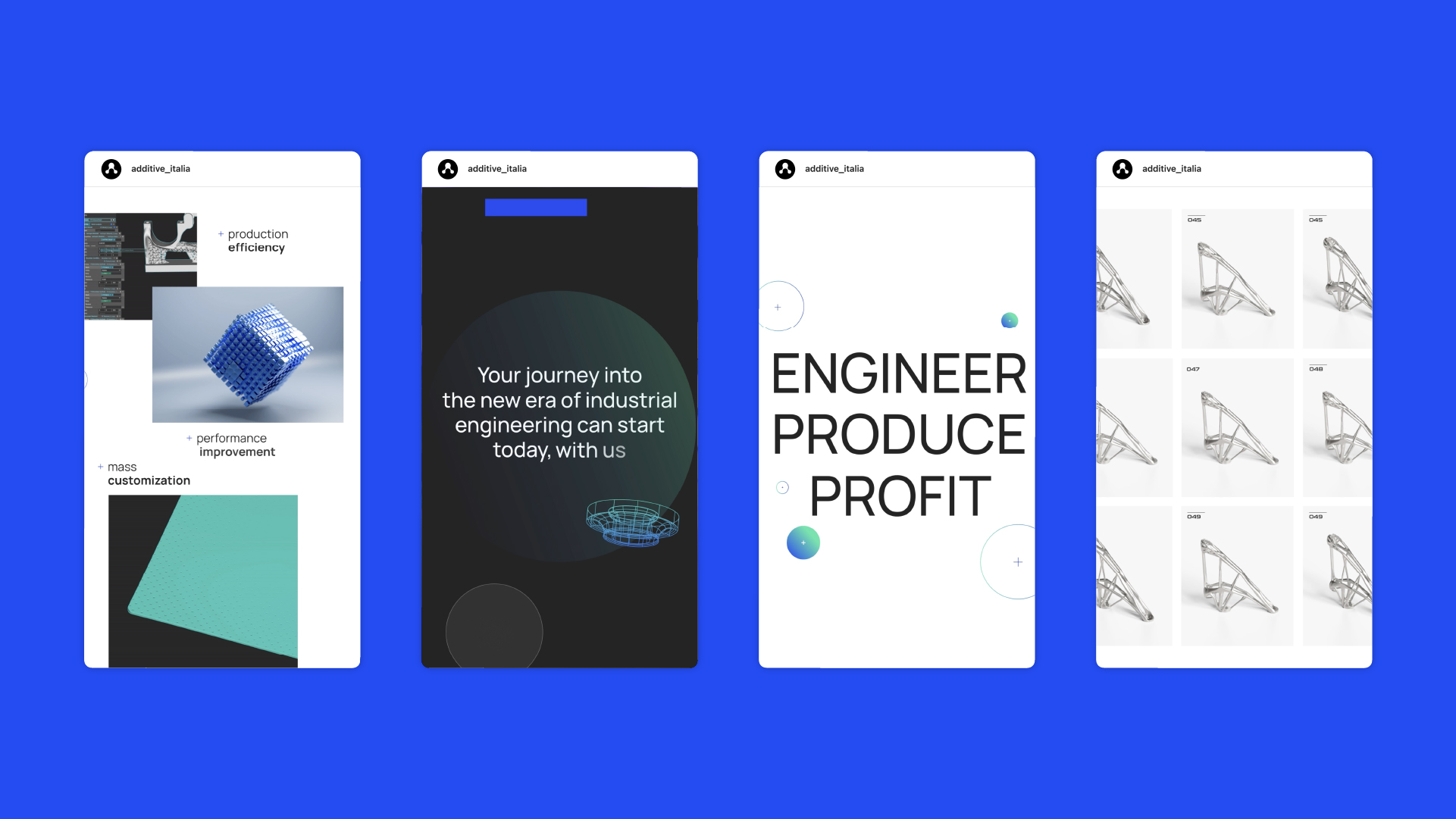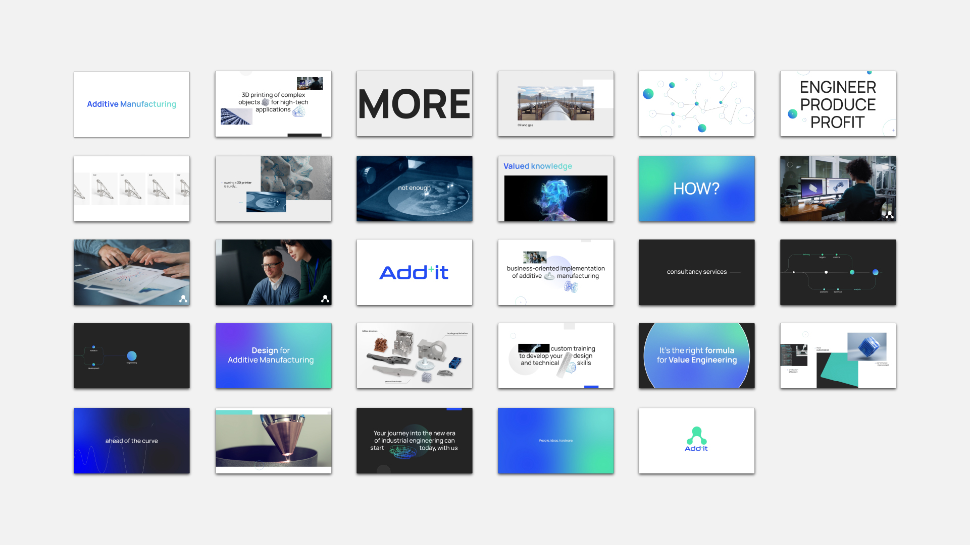 Il settore di competenza di Add+it non si limita alla stampa 3D, ma è molto di più: esplora un orizzonte ampio di competenze che va dalla consulenza alla progettazione, dalla formazione al design. Per rendere conto di questi aspetti abbiamo sviluppato un progetto creativo che fa leva sui plus di Add+it, sia a livello visual (in quanto il più è un elemento integrato nel naming) sia a livello di storytelling concettuale.