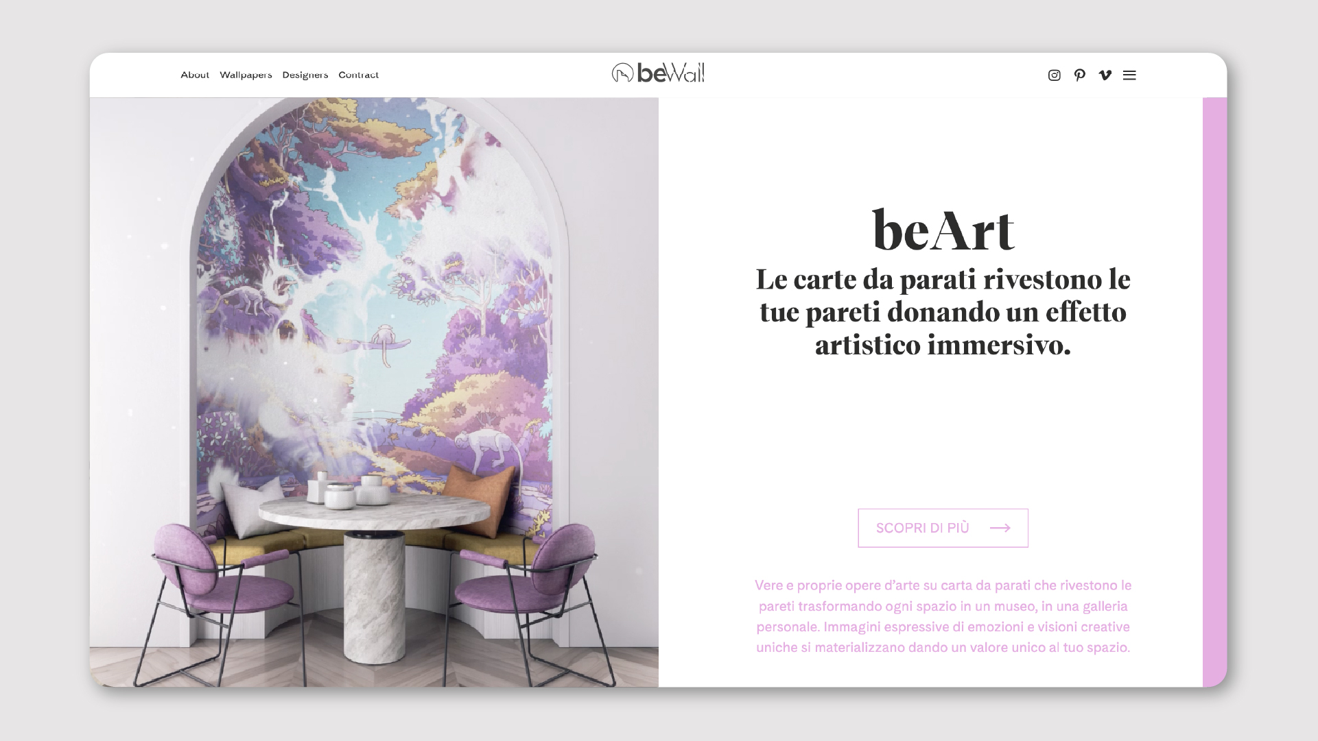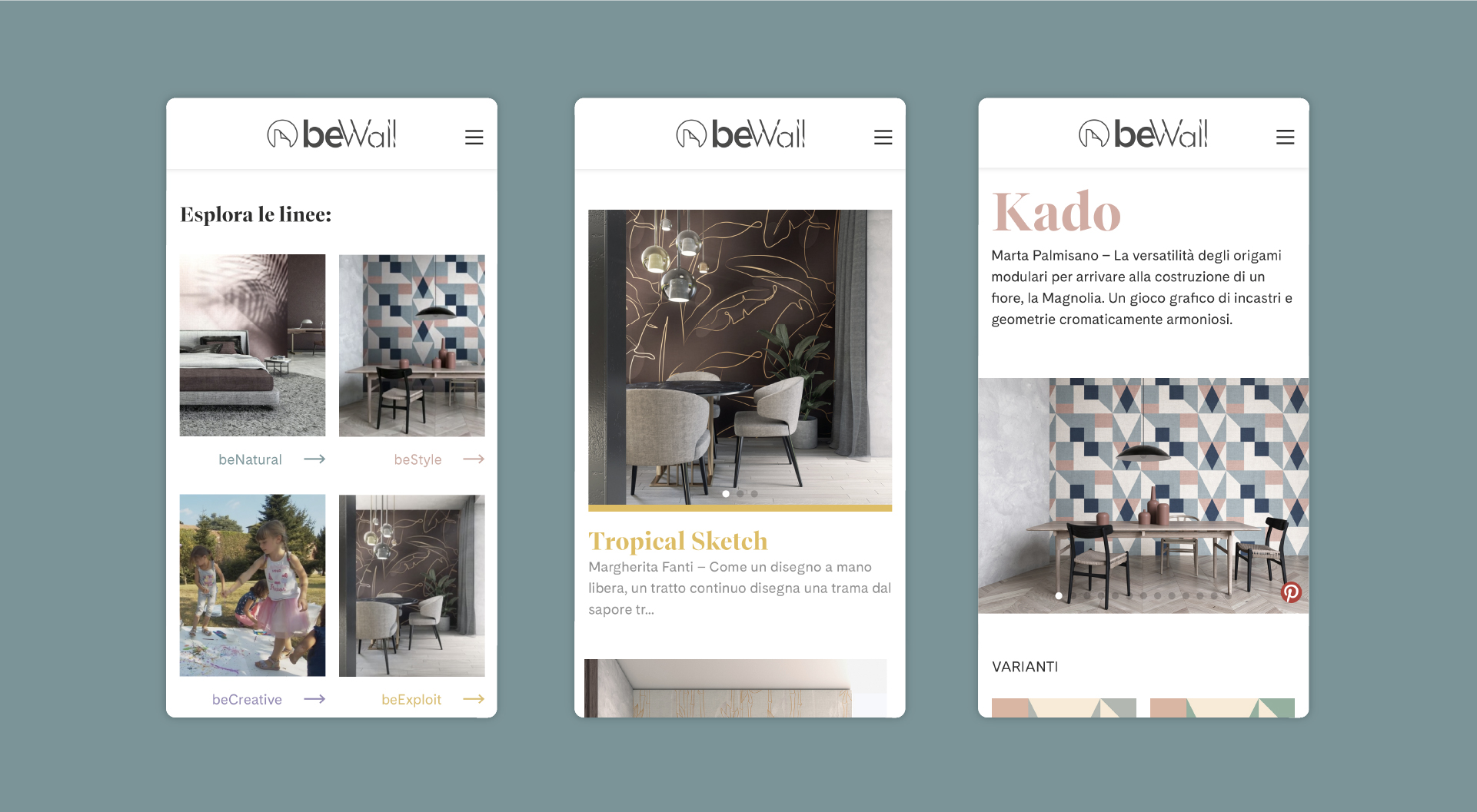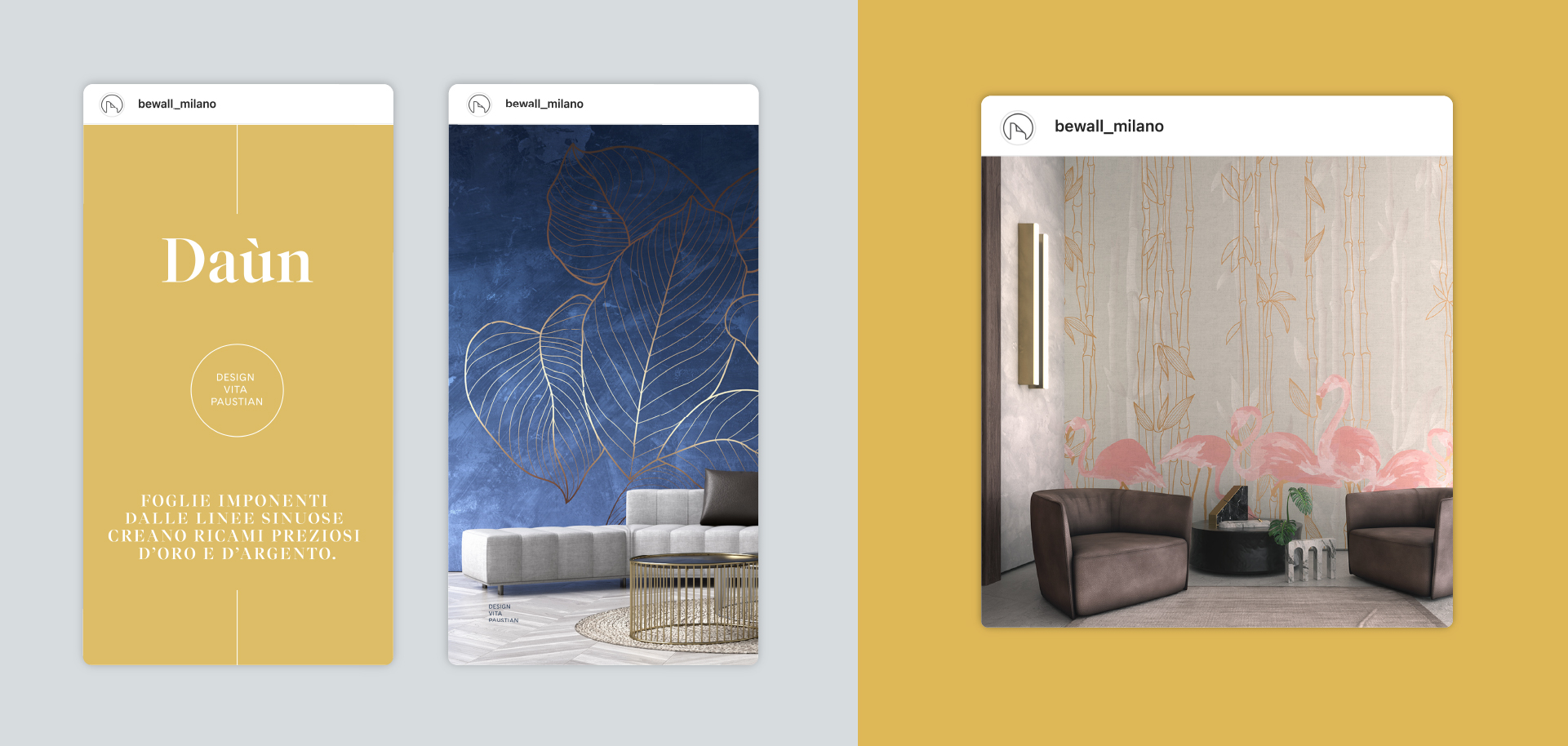 Abbiamo realizzato la digital branding di beWall attraverso un percorso di ricerca, analisi e definizione dell’immagine coordinata e della digital strategy. Attraverso un piano editoriale social e un sito web arricchiti da video animazioni delle carte da parati, abbiamo dato espressione all’ immaginario creativo di beWall. Realizziamo infine video capaci di trasmettere la visione dinamica e partecipativa che caratterizza il brand durante eventi e fiere di settore come il Salone del Mobile.