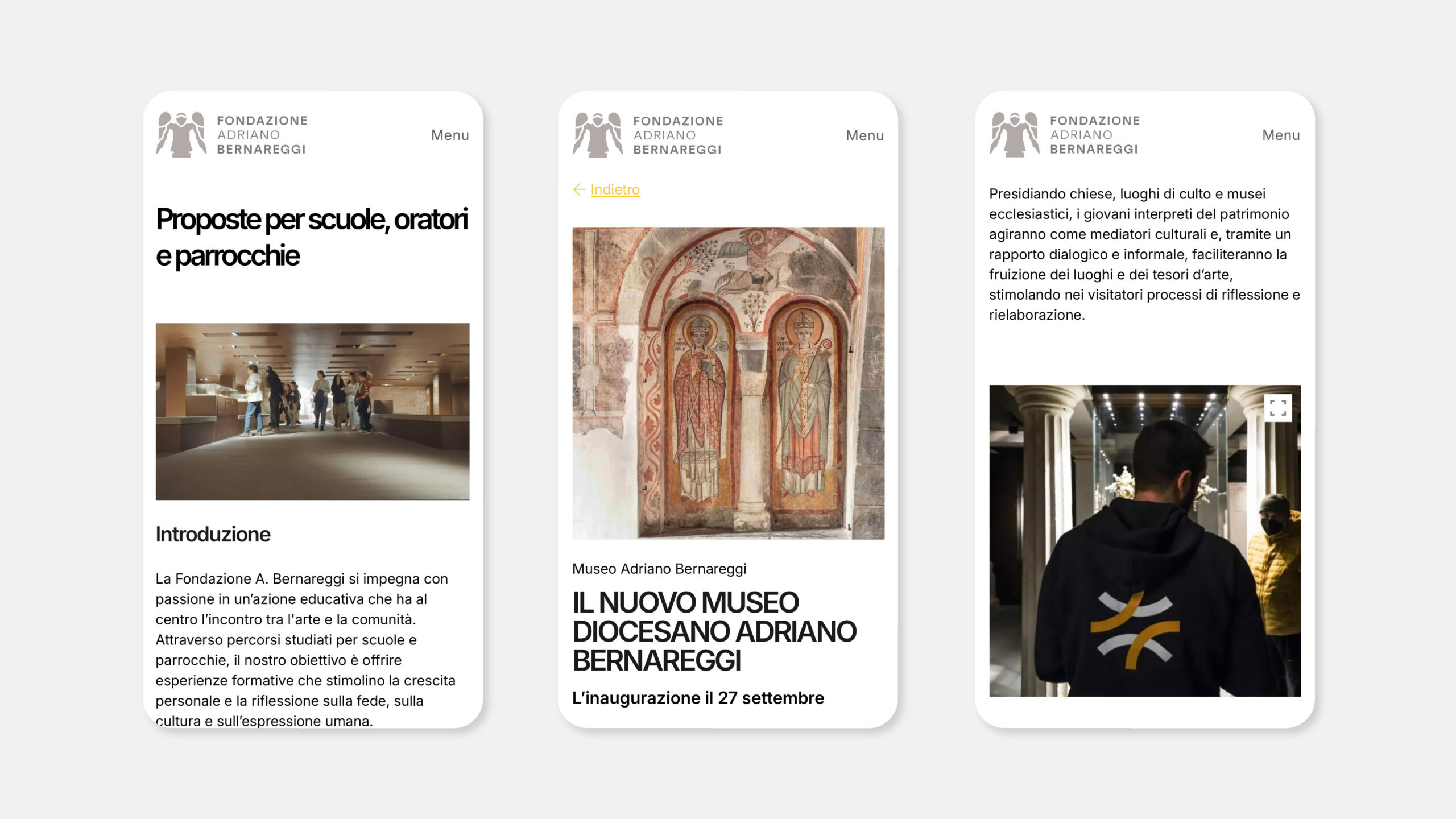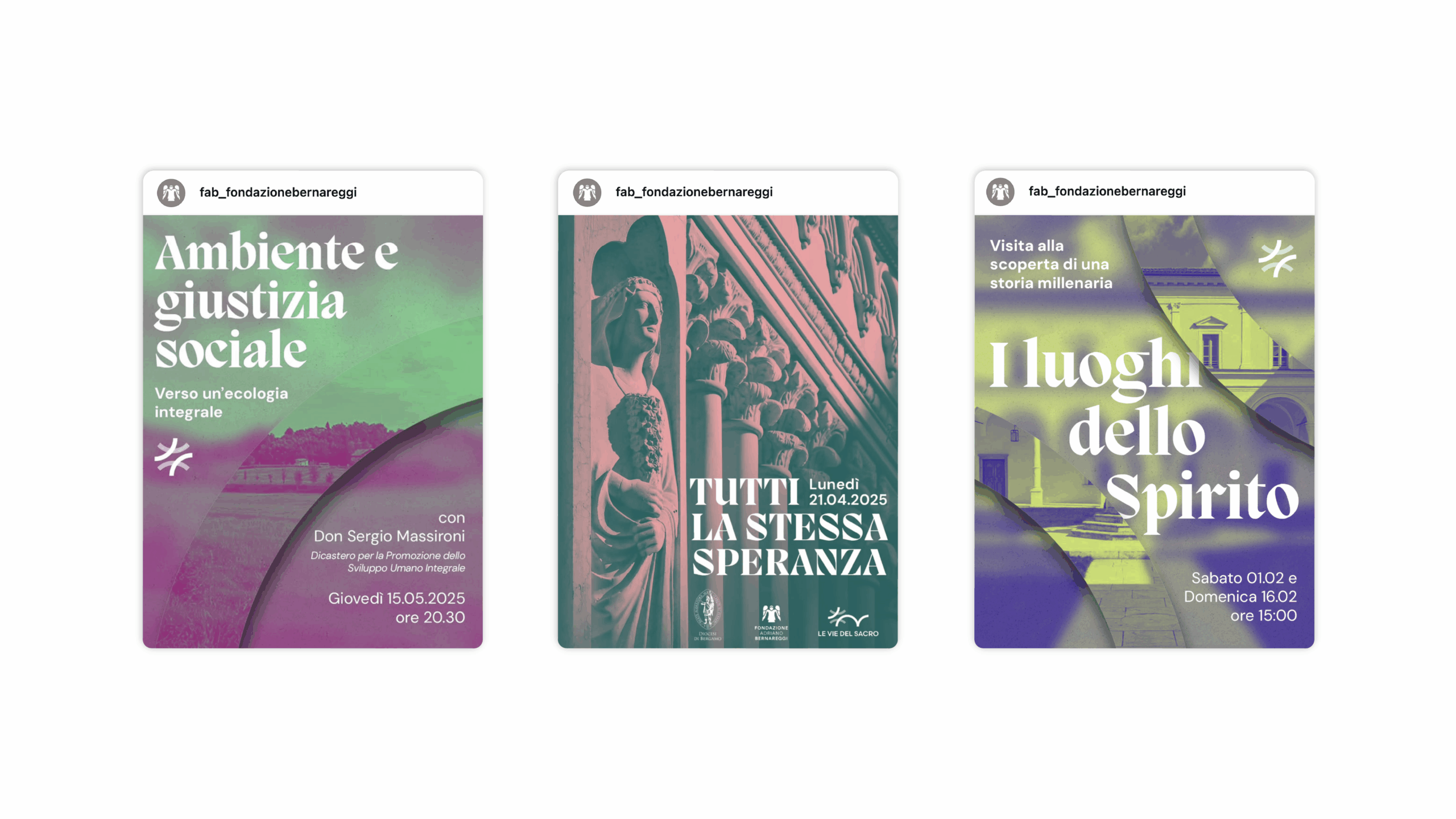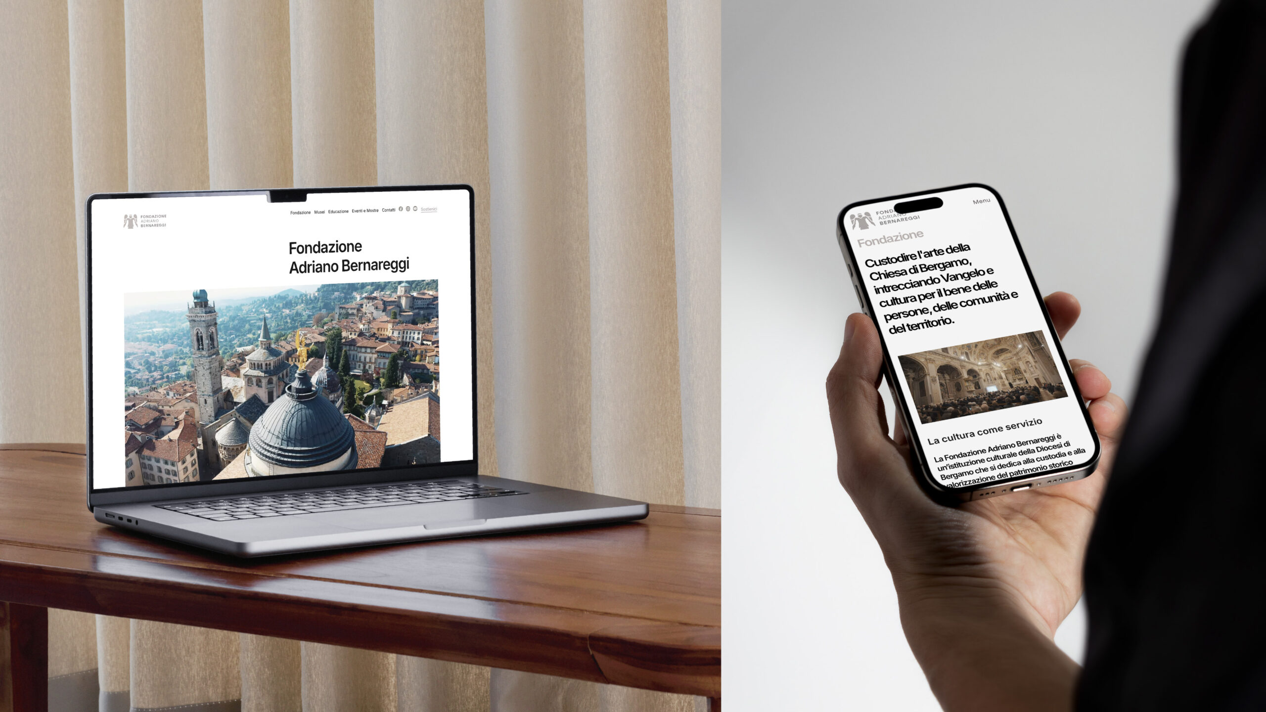La Fondazione Adriano Bernareggi è un punto di riferimento per l’arte sacra e contemporanea a Bergamo, custode di un patrimonio che unisce tradizione e ricerca. La collaborazione con la Fondazione nasce nel 2024 con un contributo pro-bono per il refresh grafico della comunicazione del progetto Le Vie del Sacro, adottato nell’ambito di Italia Patria della Bellezza. Da lì è nata la richiesta di accompagnare la Fondazione in un percorso più ampio di rebranding e nella riprogettazione del sito web.