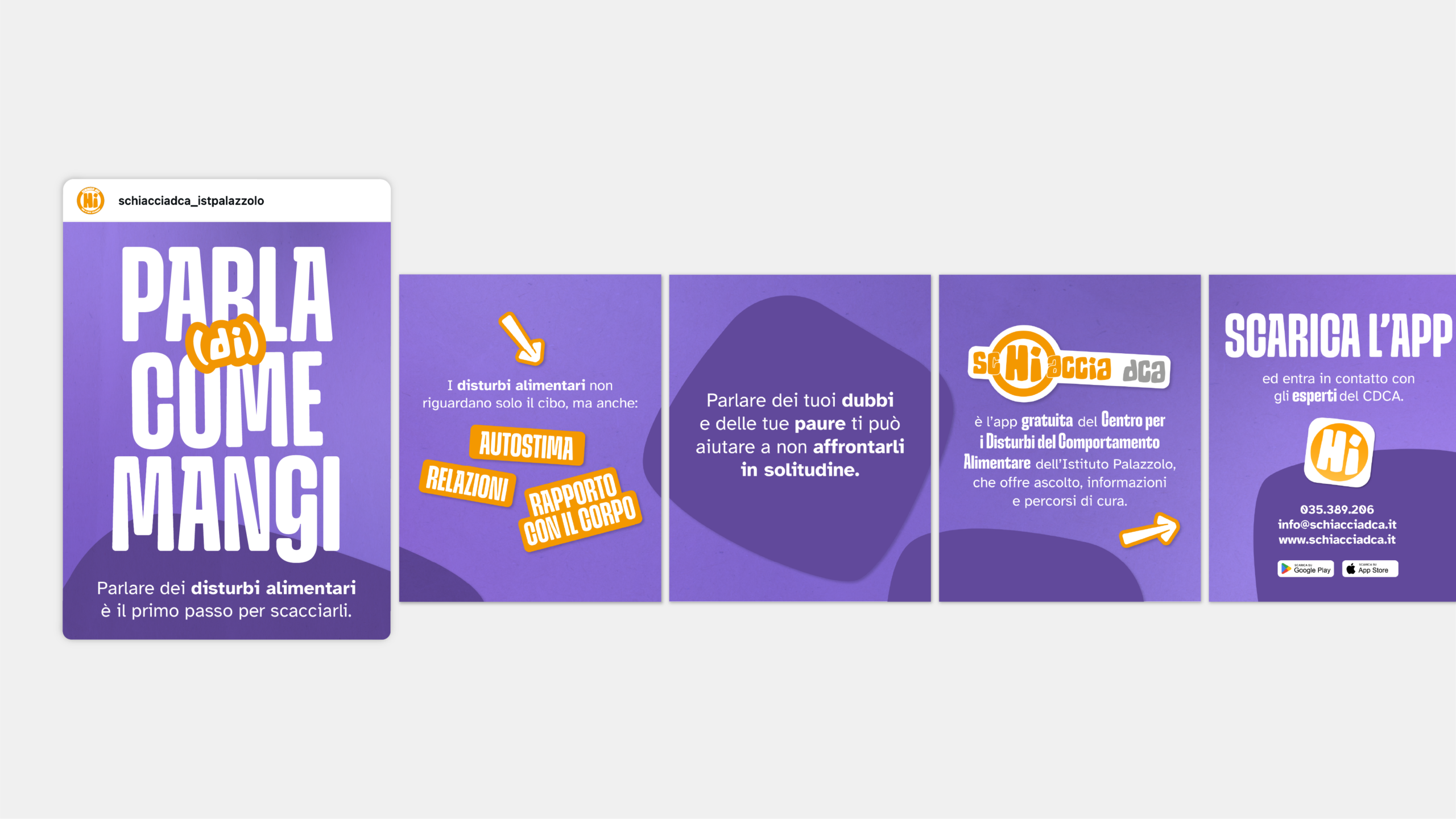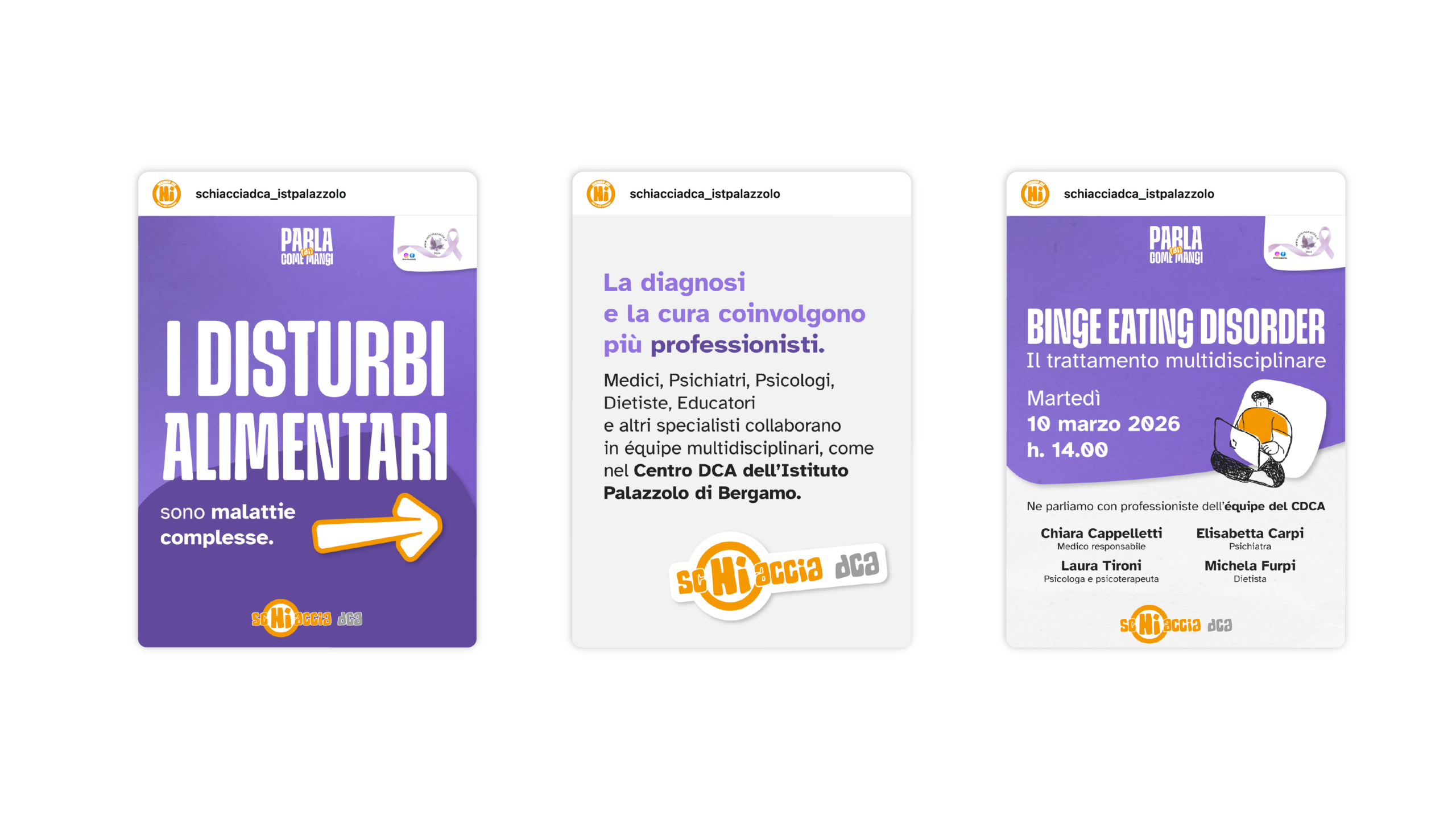 In occasione della Settimana Lilla, abbiamo sviluppato la campagna “Parla (di) come mangi” per promuovere il progetto Sc(hi)accia DCA. Il concept trasforma un modo di dire comune in un invito potente alla trasparenza: abbattere il muro del silenzio che spesso circonda i disturbi alimentari.