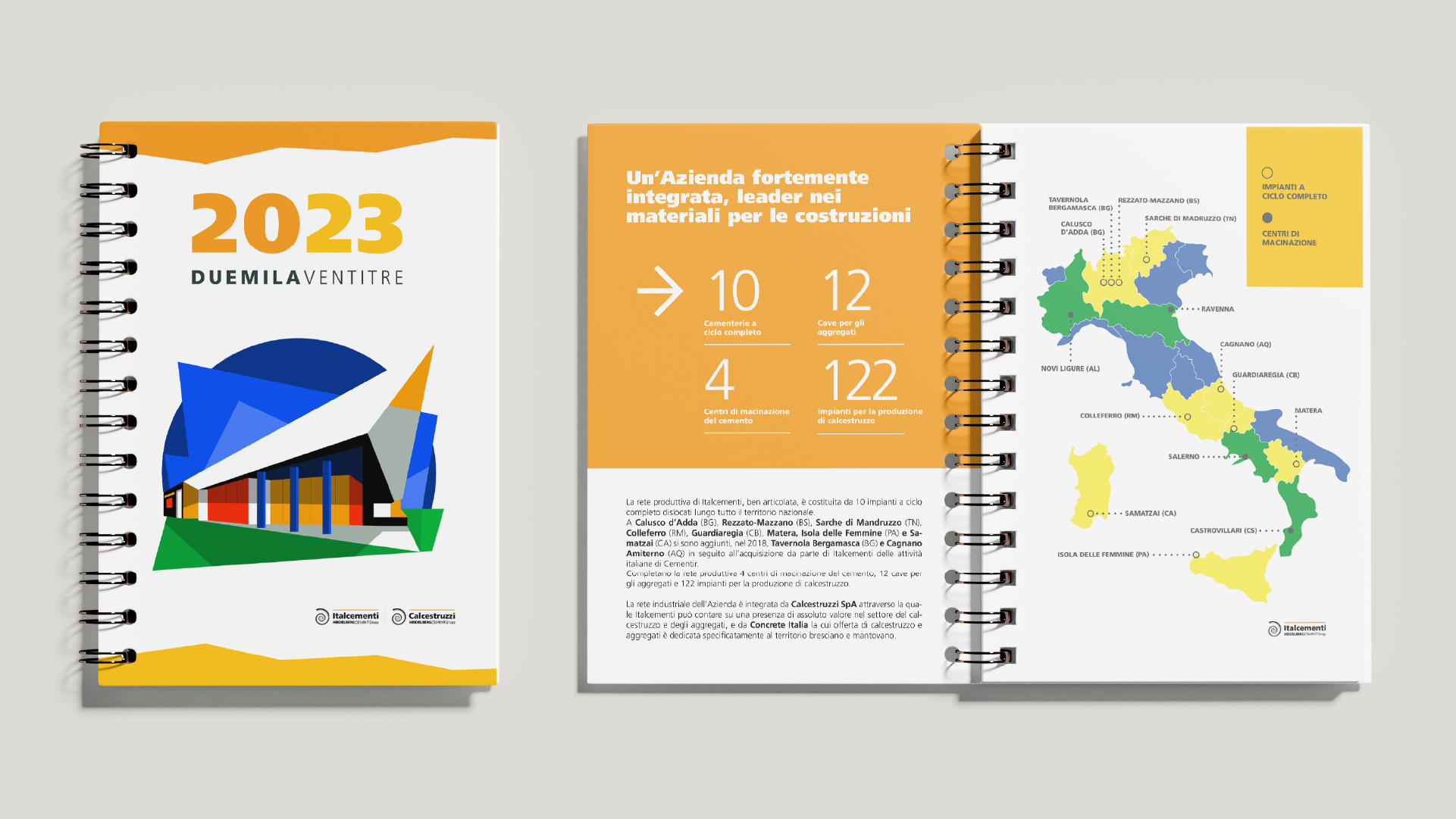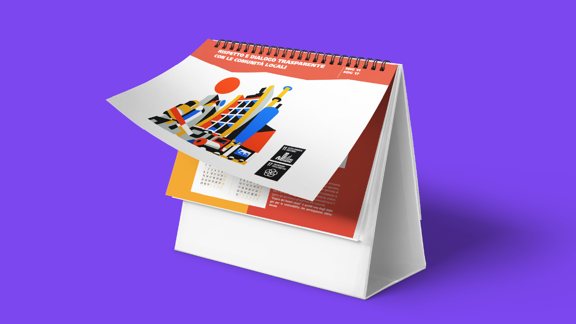 Abbiamo realizzato insieme a Luca Font dei branded gadget tra cui t-shirt, agende e calendari in cui, attraverso una sintesi di forme e colori, sono stati veicolati concetti complessi e stratificati legati al mondo della produzione di cemento e calcestruzzo, ma soprattutto ai valori dell’azienda: dalla sicurezza sul lavoro al rispetto per il clima e l’energia; dall’economia circolare alla produzione etica e sostenibile; dal dialogo aperto e trasparente con la comunità all’innovazione di prodotto, Luca Font interpreta le tematiche con un tratto dinamico e avanguardistico.