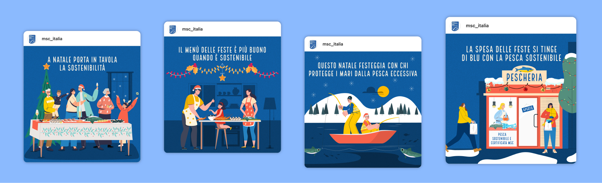 Abbiamo realizzato per MSC contenuti grafici e animati dedicati alla campagna social natalizia: post, stories, reel e relativi copy pensati per rafforzare l’attività di informazione e sensibilizzazione. Abbiamo inoltre realizzato l’impaginato grafico dei Globescan di MSC – i sondaggi sul consumo di pesce e sulla percezione in materia di sostenibilità ittica, attraverso l’uso di infografiche e illustrazioni.